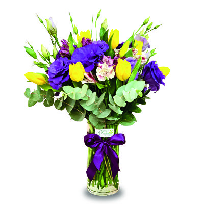 Delicado arreglo floral de lissianthus y 8 tulipanes con fino follaje en florero importado. Altura 30 cm apróx.
