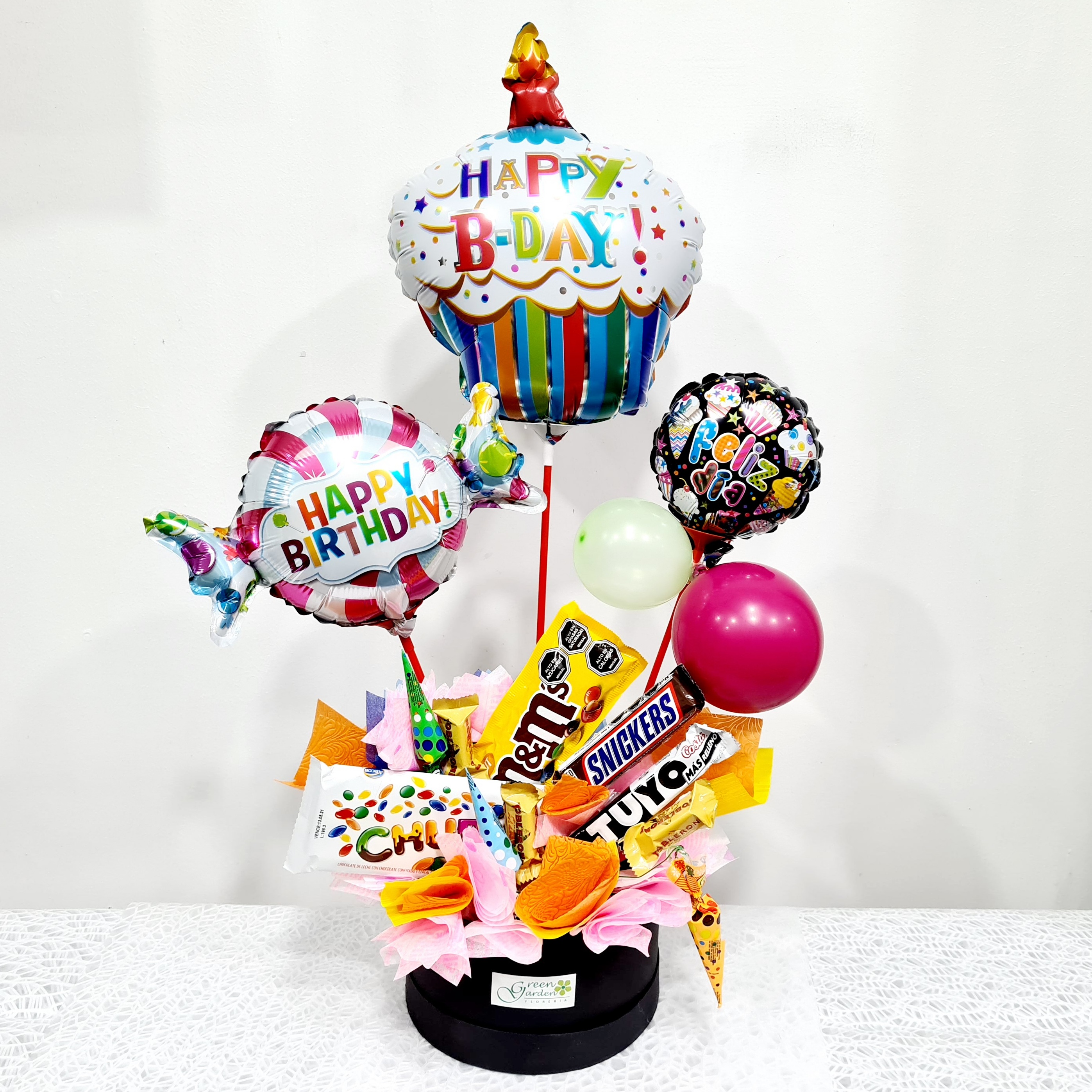 Sorprende con esta bella cajita de 10 dulces variados, osito de felpa, 3 globos metálicos y tierna decoración con papel. Incluye tarjeta de dedicatoria. (MODELO DE OSITO DE PELUCHE SEGUN STOCK)