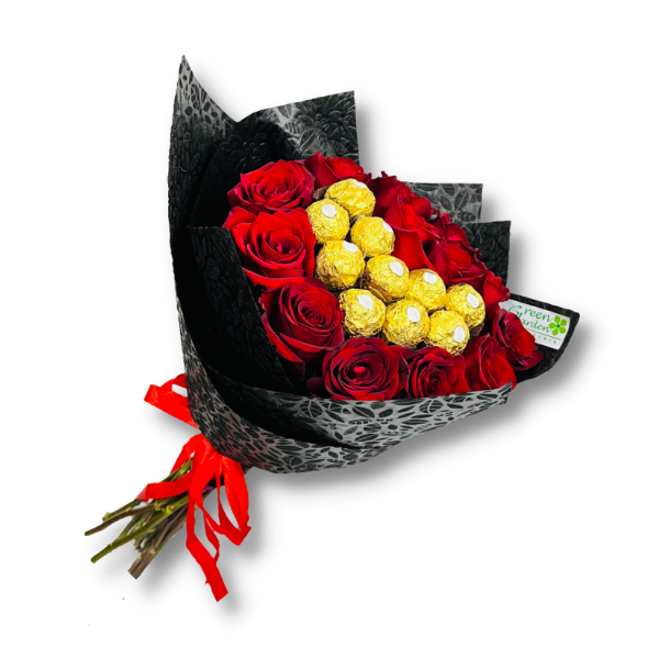Hermoso ramo de 12 rosas con corazón de bombones ferrero rocher, acompañado de papel tela negro.