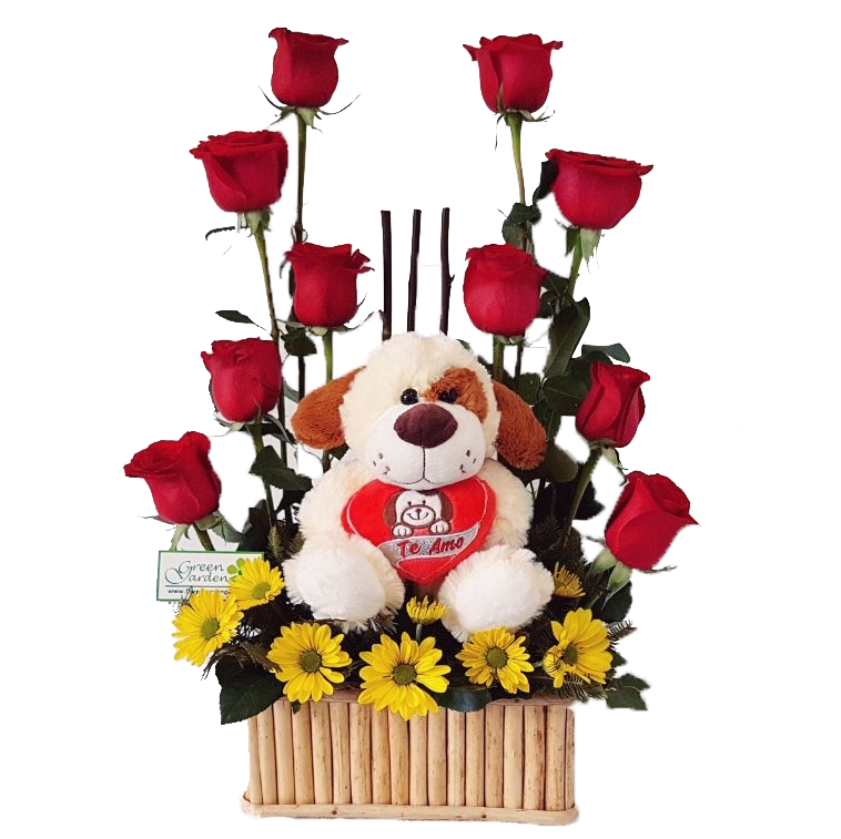 Romántico arreglo floral de rosas importadas, margaritas y fino follaje con tierno perrito de felpa; en base rústica. Altura 60 cm Aprox.