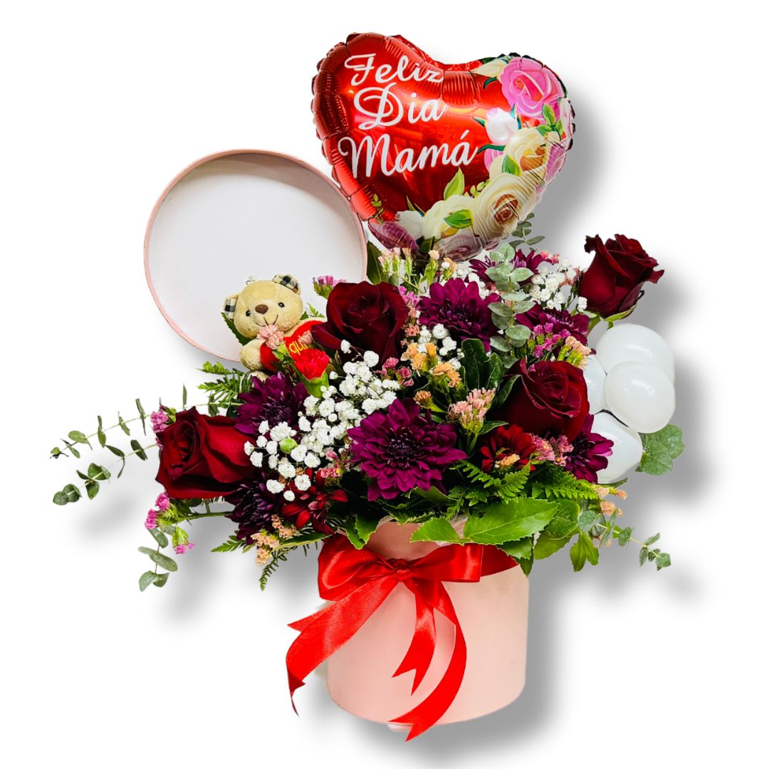 ARREGLO FLORAL DE 4 ROSAS ACOMPAÑADO DE FLORES DE ESTACIÓN, GLOBO METALICO OCASION OPCIONAL, GLOBO DE LATEX Y TIERNO OSITO. COLOR DE CAJA SEGUN STOCK.